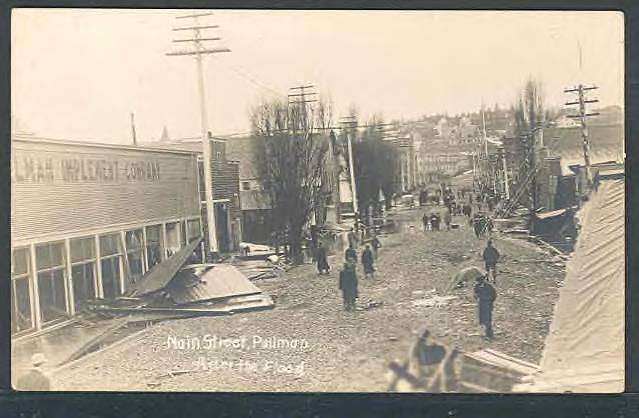 In a community in Washington State around the turn of the century. Note the fallen pole at a 45 degree angle in the right corner foreground!