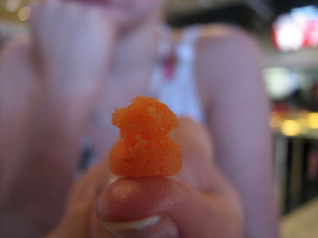 So here I am, halfway thru a day of rides at Universal Studios, Just munching down a piece of pizza, trying to muster enough energy for another 7, 8 or 9 rides, when my daughter says; look dad, I found an orange colored insulator. I look up to see she's chewed a fairly good small scale replica of an CD 168 out of the carrot she was nibbling on. I guess that kinda constitutes an interest in insulators, huh? Anyway, I thought it was cute. She was also the 1st to point out the telephone poles full of insulators along the recreated New York City Street. (next pic) |