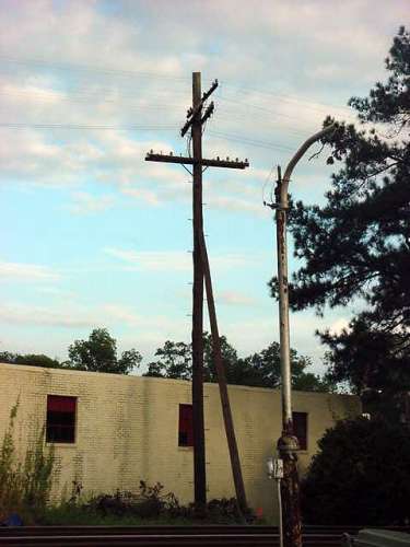 This pole is on the former Louisville and Nashville (now CSX) in Greenville, Alabama. There are many details on this pole including the steps, the brace pole, and the crossarm perpendicular to the line. Apparently, this was used to carry the lines across the tracks to the depot. The pole was still in place as of September, 2002.  |