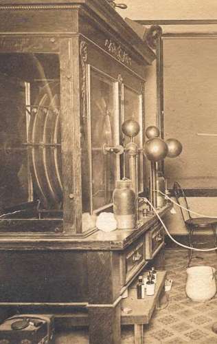 Kind of a closer look at the "lab". Circa 1910 and (seriously) a vintage hospital photo illustratng Doctor X administering goodness knows how many electrons into the patient's skull (see next photo). I think Herman Munster would be quite comfortable wherever this was taken ;-) |