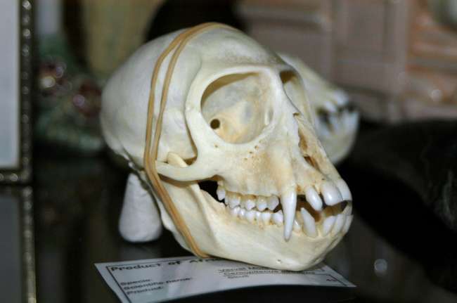 I also collect skulls. This is a small monkey skull. Look at those teeth!