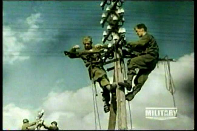Saturday night I taped a half hour segment from The Military Channel's "World War II Battlefront." It was about the Red Ball Express, the truck convoy system that replenished the Allied forces after D-Day. One scene featured Signal Corps linemen restringing telegraph and telephone wires. This picture shows a detail of a couple of linemen working on a pole. It looks like they are reusing white porcelain insulators of European design. If anybody else can add more info, please let me know. Sorry for the poor quality of this frame. It was one of the best frames in that sequence. Many of the frames show dust, scratches, etc. on the original film. When you consider that this original film is over 60 years old, with its color faded by age, was MPEG compressed for transmission over DirecTV, decompressed and re-encoded to NTSC by my receiver, converted to analog video tape at low quality by my VCR, reconverted to video during playback, converted to MPEG again by my video capture box, edited, exported as a 720 x 480 BMP file, then contrast-enhanced by me, then converted to a JPG, then uploaded to ICON, then compressed by the Picture Poster, it's amazing to me that it is at all recognizable! For those interested, the original export of the 720 x 480 BMP file had no information in the 128-255 range. What's that mean? One form (of several) of the digital representation of a picture has each pixel encoded as three bytes representing amount of red, green, and blue in that pixel.. Each of these bytes can have a value of 0, meaning none of that color, to 255, meaning the maximum amount of that color. In the case of the grabbed frames, there was nothing in the 128-255 range of values for the three colors, making the contrast of the picture quite poor. Most photo-editing software provides the ability to do contrast enhancement. In this case, I used ACDSee to expand the contrast range of the pictures. Of course the missing information can't be restored, but the contrast range is now expanded, making the eye more pleased with the results. The complete 11 second segment can be seen at http://www.youtube.com/watch?v=RgNu1gvoR7I |