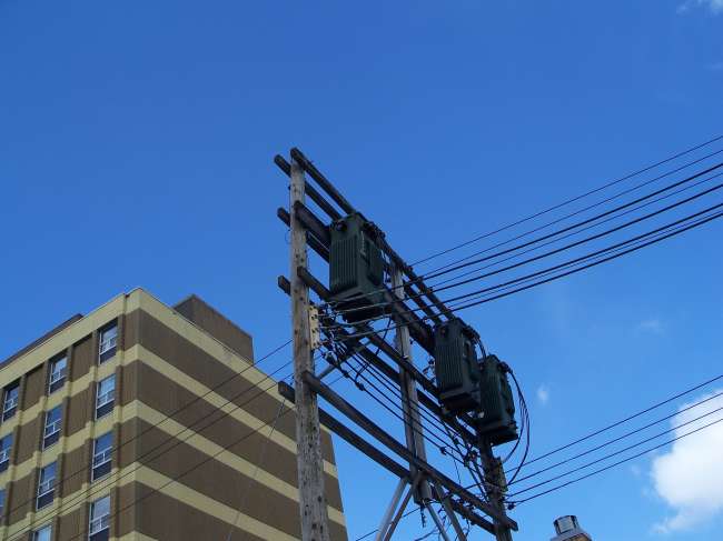 Ex Winnipeg Hydro line in Winnipeg Mb. Lots of old stuff still in the air; except for the unusually large transformers on this pole.