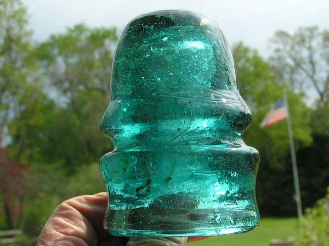What a pleasure to buy a piece on eBay and have it turn out to be better than expected. This CD 732 attracted my attention because the seller was from the same small NH town one of my daughters lives in. As you can see it`s a beauty. Almost jade like, full of bubbles and even twists of amber streaking. The condition is very near mint. I`ll post a second photo showing the eaqually neat opposite side. |