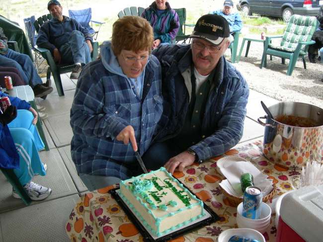 Now, what is an insulator show without a cake to surprise folks. . It all started innocently enough as Brenda was having a Birthday. Aidan thought he would buy Brenda an engagement ring . The ring fit very nicely, Brenda said YES, and Voila !!!, we got to surprise almost everyone with a cake and engagement announcement. The picture shows Brenda making the initial slice, while Aidan assists by holding the cake steady. Brenda and Aidan are a fantastic couple, and we wish them bright skies and every happiness. Next to Aidans elbow are the remains of 10 litres of Bev's World Famous Chili As usual, the chili was enjoyed by all. There was very little chili left after the lunch was finished. You will notice the small finishing touches, such as the green Diamond pony holding the serviettes from blowing away. Paper and styrofoam are no competition for 30 mph winds. Don't you have insulators on your luncheon table. |