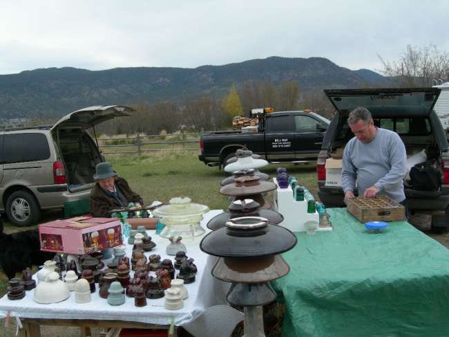 I won't be back for many a day. That's Calypso Music, Mon. Harry Belafonte, Mon!!! I know, I know, Harry who??? Calypso what, Mon. I'm too old, you're too young, and now, everyone is leaving, going home. Another show is over It looks like the wrap-up of another fun show. Thanks to everyone that attended. Vi Brown and Reid Ryder are packing up late Sunday afternoon. Vi has a 5 hour drive ahead of her, and Reid is 10+ hours from a warm bed in Edmonton. Both will be back in Merritt Sept 8-9, and we are so looking forward to their return. Under the heading of "Small World" Check out the "Bill Ray" pilot truck center background. Bill now lives in Merritt came to visit with Aidan Morgan at the Insulator show. Bill and I were both in the Fort Langley Fire Hall at one time, and neither of us was aware the other had moved to and currently lived in Merritt. Bill is not an insulator collector, so he was quite "blown away" at the sight of a 0ne acre field with 5,000 insulators of all descriptions, and all the folks that collect them. |