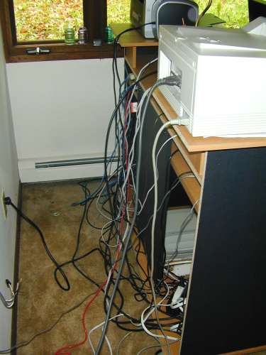The measure of a true independent setup... How many wires do you have, and where do they go? I was proud to have only one power wire coming out. From the UPS of course.... Then we have the network. Cable to Jill's laptop, along with the parallel port printer cable from the laser printer. My new computer doesn't have a parallel port. A network cable to the other PC in the media room. Connections to the outside world: Cable to the cable modem. Antenna cable from the antenna on the roof to the high definition tuner/recorder card in the computer for OTA HD recording. Phone line which goes out of the system into the rest of the house. Since VoIP comes from the cable modem, it's reversed... what plugs in one of your phone jacks is the input to the phone system. Then you plug all the phones into the other phone jacks, and it's all transparent... Of course, optional devices like external USB drives, docking station for a PocketPC, etc. aren't shown, and are not normally connected. So, all and all, a very simple well organized setup, wouldn't you say? :-) NOT! But, it works and that's saying something... |