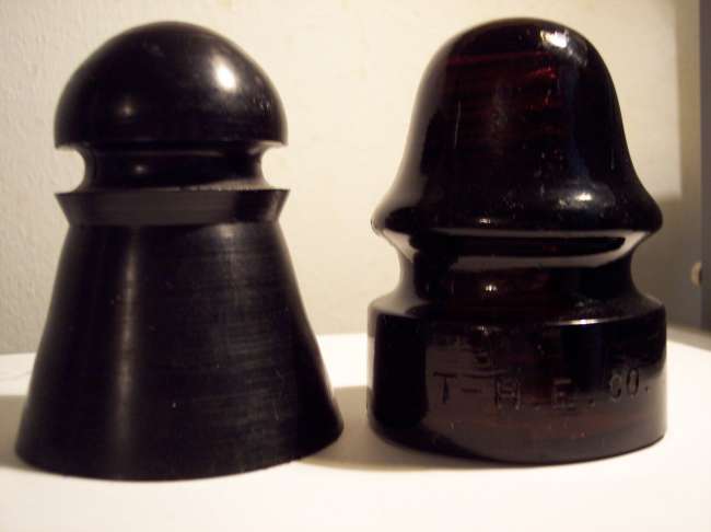 Here is a black plastic insulator with no embossing at all, has an inner skirt, and has standard threaded pin hole. I have seen a lot of plastic insulators, but not like this one. Shown next to a CD 134 for size comparison. If anyone has seen one of these before or has any info on it, I would sure like to hear from you. Thanks, Keith |