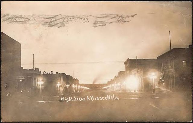 Typical "downtown" view of Americana from the mid-1910's through the 1930's with globe-top street light fixtures. The ones shown were of a pretty revolutionary style of the time. The lamps were tungsten incandescents (then-new technologically, also) within four "lolly-pop" milk glass globes which were mounted on the four short arms of the ornate cast iron posts. With an added (5th) globe/fixture often atop the center of the lamp post as you can see here! |