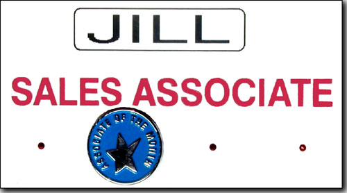 Not bad, she gets selected Associate of the Month after having only worked there full time for a month! She works at the Acton, MA store. Yes, that's the writing around the circumference of the little pin. Can barely see it...