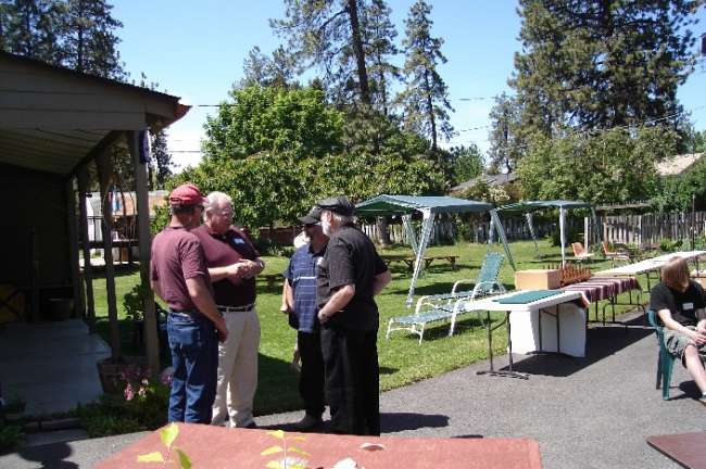 The show started out as a Saturday show, with an invite for all to just come hang out Friday afternoon and evening. This lasted about 30 minutes before some just could not restrain themselves and loaded up the tables. Here is a shot of L to R Mid Norris, Lou Hall, Steve Blair ( Hi Ya'll), and Jerry Buckland just chatting it up like they were supposed to ;-D before things got out of hand. Colin Dahlquist quietly shaves his legs at the far right in preparation for the monster truck ballet. |