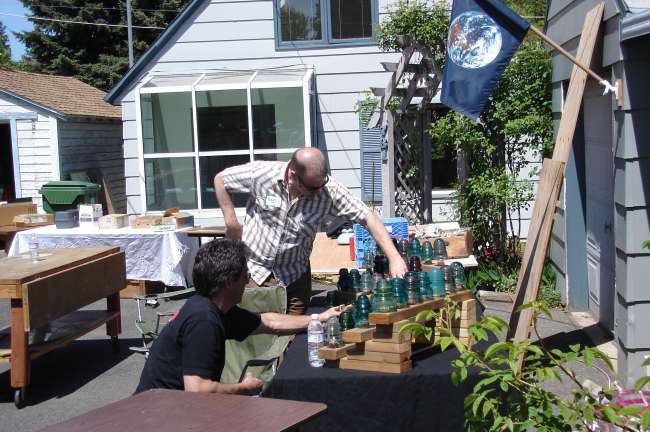 Try as we might, certain ne'er-do-wells managed to get past security and set up tables Friday afternoon. Here we see typical riff-raff Bill Burger (black shirt) explaining to Enid Funkwalter (often called Brad Dahlquist) why guys from Montana collect these glass things. |