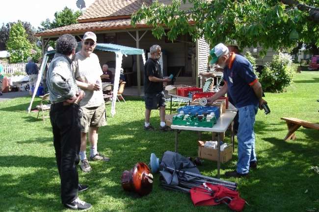 L to R - Bill Reid and Tim Wood talk about something stupid way back in the background, while up front at Bob Jackson's table Robin Harrison tries to further convince Bob Scafe that there is no future in anything but mud. Mark Storaasli has something aqua on his thumb, while Glenn-Bob Drummond searches Bob's boxes for that elusive foreign 1871 Patent porcelain. |