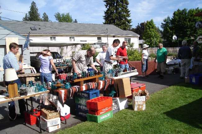 L to R - Dan Simmons intently watches Brad Dahlquist, as Kelli Simmons makes mid-show hair adjustments. Chuck Irwin seems to be watching Dan Simmons watch Brad Dahlquist, while Don Hardesty and Steve Nickoloff appear to be pondering the pavement. Hostess Joan checks Gil Hedges drink to see if Jack Roach has added any "spice" to the mix (contraband), while a couple of dark figures lurk in the shadows at the far right. |