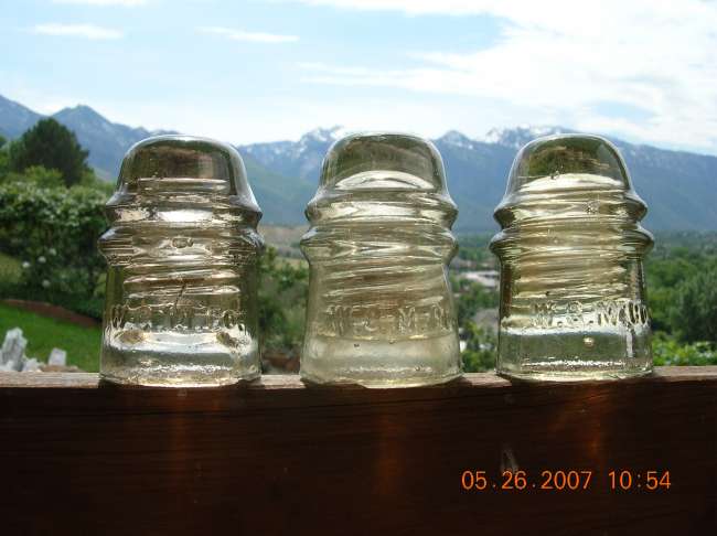 Here is a nice trio of straw W. G. M. tolls I picked up. The middle one is the most interesting because it has milky stringers and seems to have been pinched or something when still warm because it is mis-shapen. Do you see many W. G. M. Straw tolls with milk in them?? Any input or comments are appreciated. |
