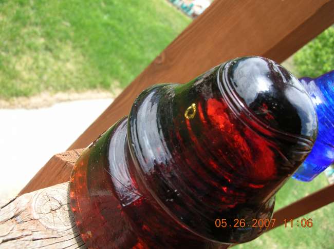 Here is the picture of the dome of this red insulator. There is a yellowish/gold colored ring of metal that we are pretty sure could be a piece of gold. I have heard they used gold to turn glass red so this would make a lot of sense too. This insulator seems to lean more towards red than amber but since there is no true Red insulators, how can we determine an insulator as Oxblood? Any help with this question or comments on the gold, or any other opinions are greatly appreciated. Thanks. (Its a good thing insulators aren't scared of heights) |