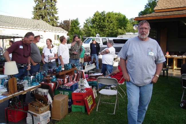 L to R - (far background) Don Hardesty mans his table. Up close, an intent Mid Norris madly looking to feed his mud jones, while Tex Jackson explains to Hostess Joan how to deep fry caterpillars and sell them as shrimp. Then there is me, telling The Spad where to go. Gil, Glenn-Bob, Chuck Irwin, and a mostly hidden Steve Nickoloff fill out the background, as a disgusted Jim Cunningham leaves the scene, a phone sign still sticking out of his ear. |