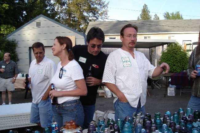 L to R - Tim Wood talking with himself again, while an alarmed Terry Drollinger discovers he's being pick-pocketed by Bill Burger. Hostess Joan daydreams of eating corndogs as a semi-comatose GOM pick-pockets himself while simultaneously trying to direct the orchestra. |