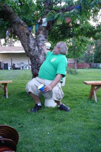 As Gil gives a history lesson on the days before toilet paper and explains the modern benefits of wiping, he displays his gymnastic agilities in a single twist-and-reach maneuver while only allowing the drink cup to tip to a point well short of spilling. |