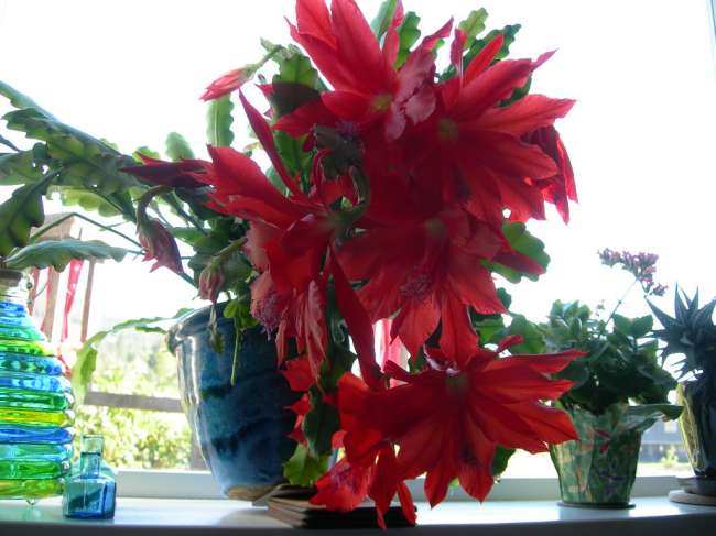 This is my other collecting / growing interest. These are commonly known as Orchid Cactus. [Epiphylium] Spectacular in bloom, they are tropical / semi-tropical plants that grow in the forks of trees in the wild. They manage to live and bloom strictly on the debris and moisture trapped in the forks of trees in the jungles. These flowers are 6 to 8 inches across, and some do get larger. They live under the forest umbrella, and do not like direct sunlight. As you can see in the picture the plant is top heavy and wants to fall over. I have had to prop it up against the window to get the pictures. During the year the plant sits nicely in its pot, but when blooming, the flowers are quite heavy, causing the plant to topple over. My wife Bev, looks after the well being of these plants all year long, but as they begin to bloom, they become "MY" plants. Last year there were only 6 blooms, but this year there will be at least 17 beautiful flowers. They come in a variety of colours, but the 2 plants I have in bloom are both red. If any other "Epi" fans out there have plants in other colours, I would be interested in doing a swap of cuttings. Thanks for taking the time to check this out. |
