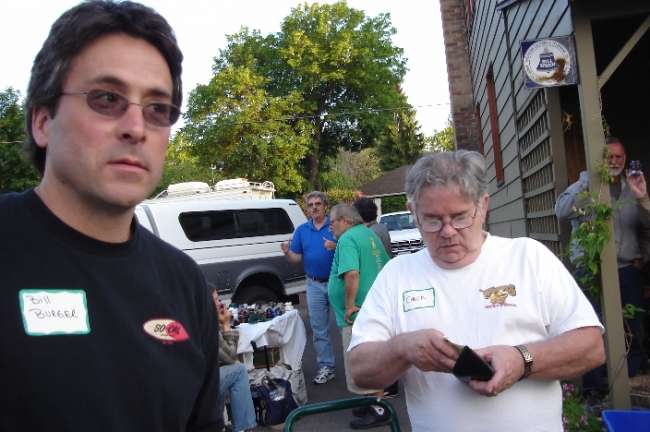 Bill Burger eavesdrops as Ron Yuhas gives his famous oratory on how Miracle Whip is better for you than Cheese Whiz to an entranced Gil Hedges and a barely visible Spadmaster Rain as a third unknown party looks down the drive to check for unwanted guests. Bob Jackson also eavesdrops, and an always straight-up moneyman Chuck Irwin gets out his wallet, saying "I pay good money for such good information!" |