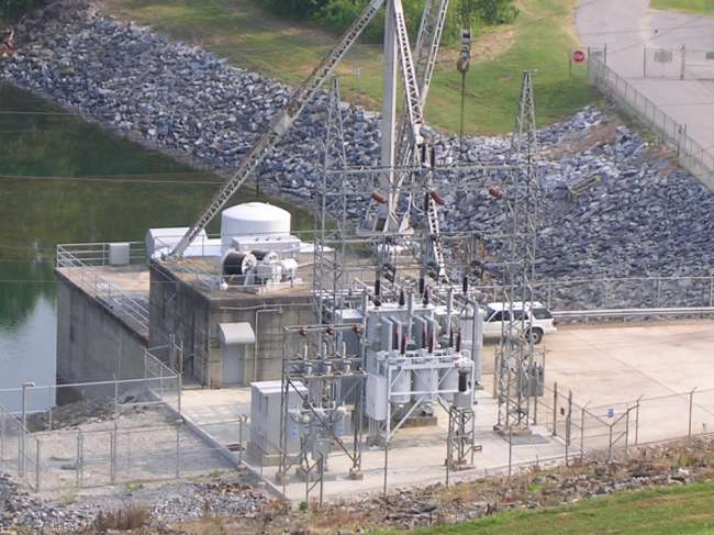 A closer look at the same station posted over in "fun stuff". Lots of transformers, big insulators, and HV power lines everywhere. Not only does this station generate electricity, it also serves to control the water level in Lake Chatuge, and can pump in water when needed, during low power demand times.  |