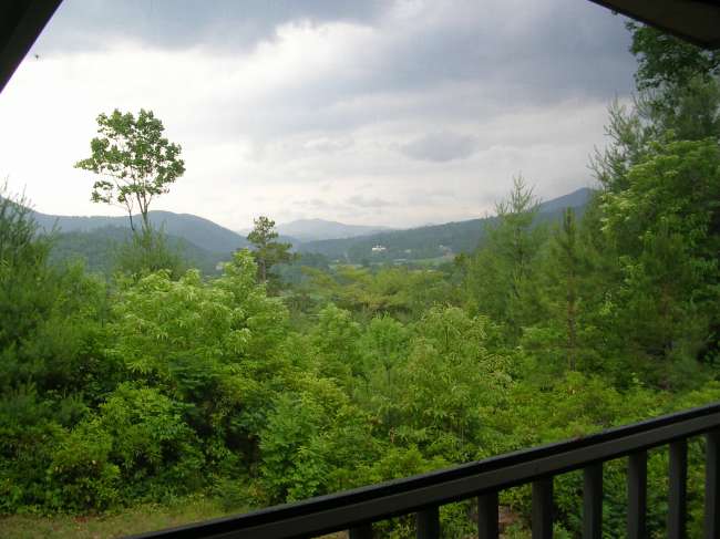 The view from the back porch, facing due west. The large white house in the center of the photo is almost a mile away. A rather hefty thunderstorm is slowly approaching...