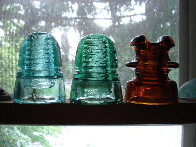 Here's a little bit of color I added to my ever growing collection. The middle is a light green Brookfield CREB. My first color other then aqua or light blue. To the right of that is my new flash red Hemingray 661.