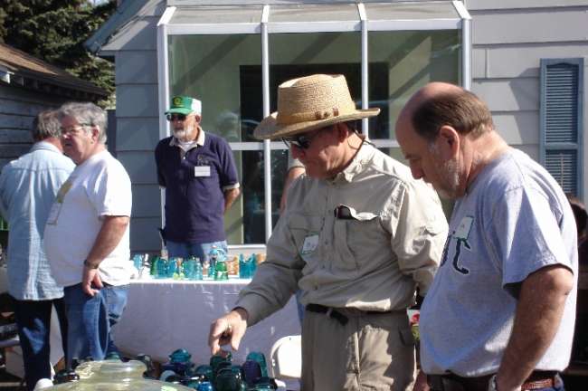 Warrant Officer and sometime snake oil salesman Glenn Drummond surveys the scene from a back corner as Chuck Irwin contemplates the origins of the corndog. Up close, Mike Guthrie explains to a still mystified Tim Wood that there are guys in Montana that collect these glass things. |