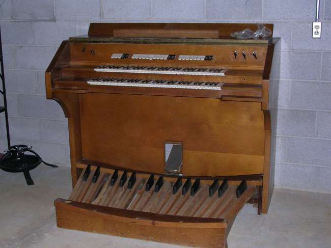 This is a 60s vintage, all-tubes Schober Organ that my Dad and I put together from a kit, back around 1963. The keyboard and foot opedal contacts are badly corroded, and at some time in tne past, a few families of mice were using it as a luxury condo... If it is indeed possible, this wil make for an interesting restoration project. It is located down at my place in NC. This is down in the nice and dry (and hopefully rodent-free) cellar. Inside are about 65 12AX7 dual triodes, and a smattering of other vacuum tubes. No transistors or ICs in this beast! Unlike Billy's B-2, any atempt at making this particular organ fully operaational, is about as likely as re-floating the Titanic... Supposedly there are new designed after-market solid state tone generators available for this organ and they will work with otherwise "flakey" keyboards, so that may be the viable alternative for me... Maybe I'l just fit a couple of cheap Casio Keyboards in the appropriate locatiions and call it a done deal ;-) |
