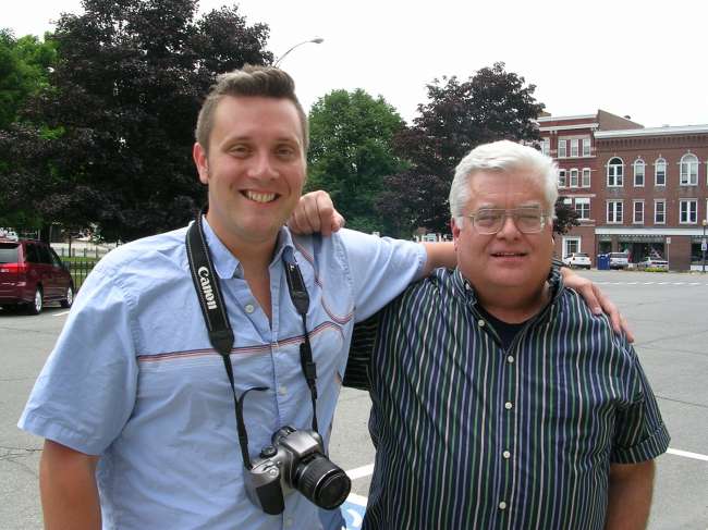 Or in this case, a double mug shot... I already have one in the "official" mug shots indexes, so I 'll just post this one here... I met up with a long-lost buddy in Lebanon NH over The Fourth. He is the taller smiling and handsome, looking one, I'm the short old decrepit chubby one with the gray hair ;-) |