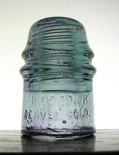 Here is one of several recent additions to my Denver glass collection. This is a cool looking two tone R Good piece. It is a light aqua and light purple two tone piece. There is no real color separation, but more of a swirling nature to the color mixture. |