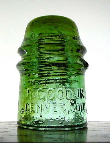When I purchased this piece, it was characterized as a 'three color green' R Good toll. I was unsure of what it would look like in person - but I was pleasantly surprised. It truly has three different shades of green in it. The right side of the skirt is a light apple green color. The left side of the skirt and the lower wire ridge is more of a yellow green. The dome has heavy amber and the color is almost an olive green. There are nice amber streaking in the dome as well. |