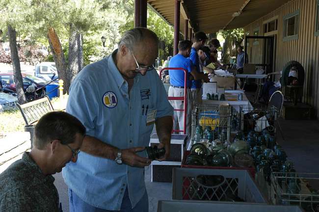 The public was invited to bring their insulators in for appraisals, then given the choice to sell them at a set price with a ticket drawing system. Pre registered collectors would drop their number in a can and the winning number drawn would win the grouping at the set appraised value. Here you see Glen Adkins sorting through a table load of common stuff he just won for 500 big ones, while Dave Brown teases him for buying a bunch of junk! |