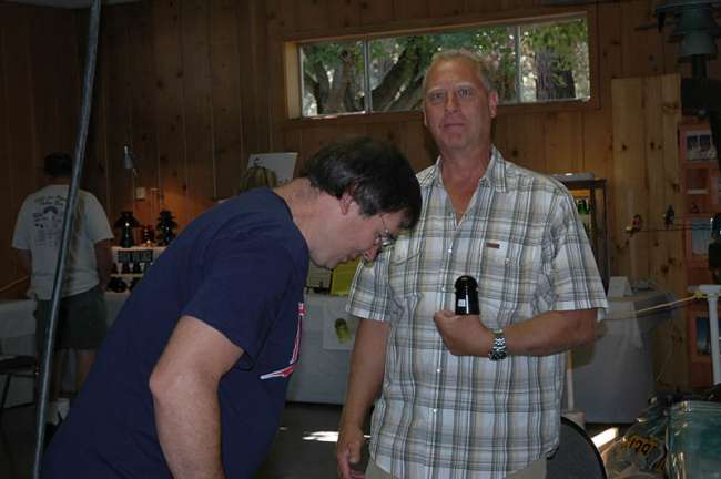Mark Hilton holds back the pain and tries to crack a smile for the camera. Dale Huber accidentally smashed Mark's thumb with a Mexican multipart and the swelling was enormous! Also, at this point in the photo Dale is attempting to give Mark a matching toe. All humor aside, Mark picked up a nice dark olive amber Brookfield pony for his Brookfield specialty collection. |