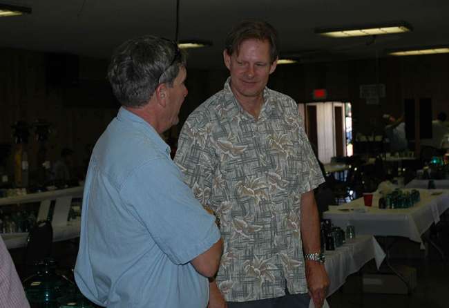 Two longtime collectors, Steve Marsh (left) and Bart Magoffin, share some insulator stories as the show begins to wind down for the day.