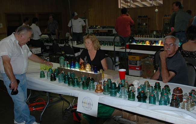 Bob Loftus (right) and his better looking assistant are wheeling and dealing with Frank Feher (left). Take note of Frank's right hand, as he practices for the Insulator Collectors' Olympics. Frank will be entering the "How many insulators can you hold upside-down in one hand" division. |