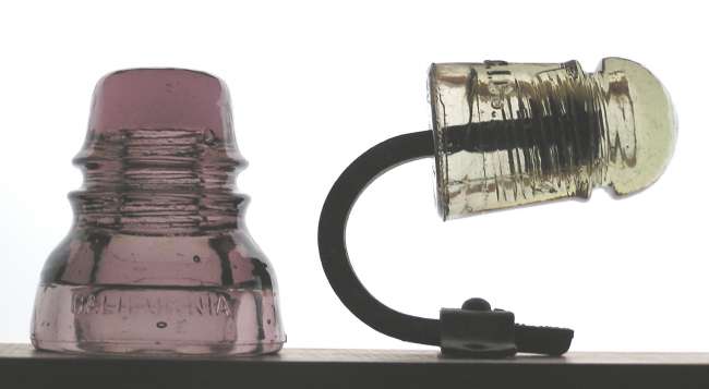 Tough adding new Californias to my collection nowadays, so I was quite pleased to acquire these two Cals at the 2007 Placerville Show. On the left is a dark purple California hoopskirt CD 152; about the darkest I have seen. It came out of a lineman's estate collection. Thanks Greg Bickford! On the right is a tough straw color C.G.I.Co. pony, CD 102, still attached to its original steel pin. It has the wire coil threads that won't release the insulator, so it will stay on the pin. Our show hosts did a lot of local advertising to attract walk-ins with insulators to sell and this was the best item in one insulator lot. Paul Greaves actually won the rights to purchase the insulator lot. Thanks for splitting up the lot Paul !!! |