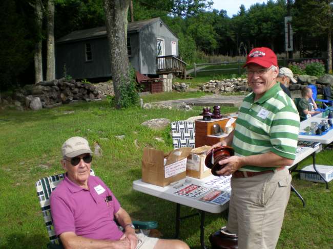 L.A. is our connection to this great site for our picnic. Here L.A. is checking in with his good friend Phil Harding. L.A. is a club member at the Rod and Gun club. BTW, that`s "his" building in the background and "his" skeet range. I guess it`s his because he manages the skeet range. |