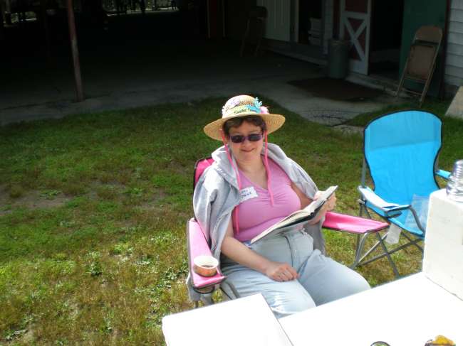 While Bill slaves away trying to make a buck selling insulators, The Queen Bee, Jill, soaks up the rays, reading some romantic novel and slugging down the cool drinks.