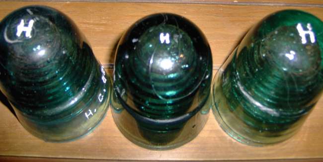 OK, here is the top of the CD 145 HGCo's. The order is different than the last picture. The one on the left is the one on the left in the last picture, and the two to the right are switched. The left one has a H on the dome that does not line up with the embossing on the skirt, as you can see. The one in the middle, the insulator with the larger embossing, has two very small H's on the dome which line up with the embossing on the skirt. The right insulator has the same size H as on the insulator on the left, but it lines up with the embossing on the skirt. I know there are many variations with embossings with other insulators, but I didn't know a CD 145 HGCo had variations like this. I thought it was pretty straight-forward compared to a CD 121 Am Tel. Does anyone know about these like if they were made at different plants, different years, ect.? Any thoughts are appriciated. |