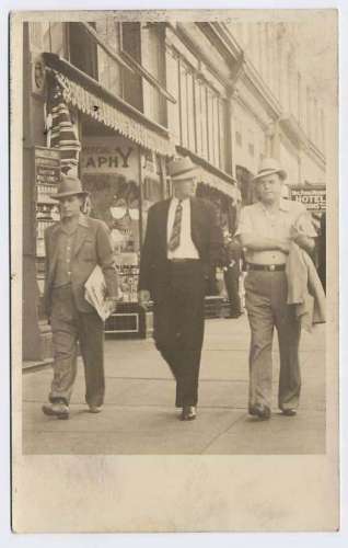 Photo taken in the later 30s or early 40s. Would you buy a used car from any of these fellas? Hmmmm! What's the guy on the right reaching for in his jacket pocket? Yikes!!!