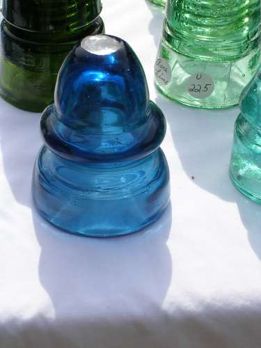 One of those so-called "Mexican" threadless fence post topper insulator thingies. In a nice dark sapphire (?) blue. The actual origin and purpose of these glass curiosities is open to much conjecture, so here is mine: Allegedly designed and hand-crafted by none other than world-class adventurer and bon vivant, [id=274721590; Manuelito Rasmussen Hemingray], who was then 110 years old, at his secret government "skunk works" laboratory near Scorpion's Forge, Arizona, in early July 1947, about the same time that the legendary Roswell UFO crash allegedly occurred. Perhaps ET from Zeta Ridiculi was in pursuit of this stunningly advanced glass technoloty ? |