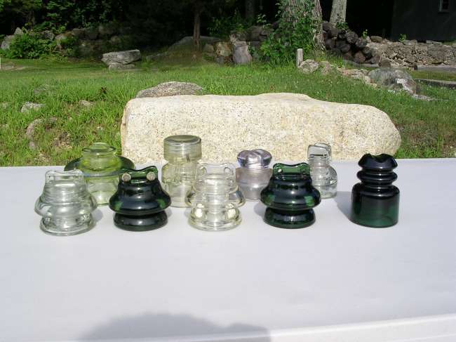 I brought along some interesting Italian and Hungarian glass for display. Four of the two-piece CD 698 "frogs", three Miva, one Fidenza embossed with 6012-C on the top shell, and 6012 on the bottom part. One light-yellow CD 402 Capolinea, a light purple Fidenza 6123 power insulator, an unknown dark green "double throat": Miva piece, and one of the glass insulators form Hungary, that I bought from Zoltan recently. The back row, item on the left is a Miva UNES 1205 in a citrine / chartreuse color. This one seemed to generate the most interest. The Hungarian insulator has "standard USA" type threading, as do some of the Romanian insulators (CD 408) . At least they fit onto a US standard wooden threaded pin. |