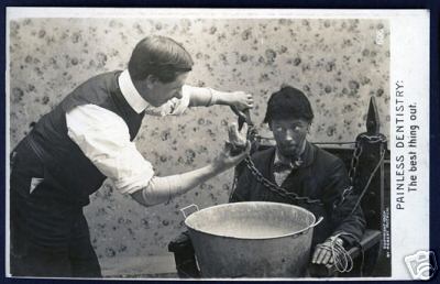 Photo taken sometime between 1900-1910. As you can see the patient has some electrical wires connected to his fingers and wrist. Also there's a restraining chain crossing the "subject's" chest for some reason. That probably was a pay-as-you-go thing back then. A really big metal pot was placed in front of "the patient" for whatever purpose(s) you can imagine...no comment here. Anyway, when the dentist "threw the switch" you can betcha the patient did not feel a bit of a thing as the dentist administered his "procedure"..... |