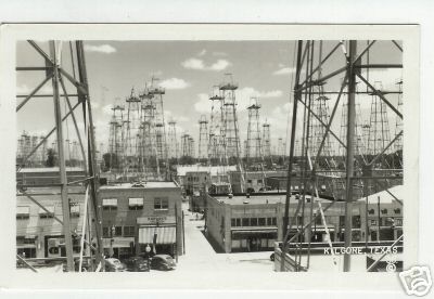 Don't let 'em tell you that constructing power lines nor anything else for the benefit of this Nation's growing energy needs is unsightly. Here in the late 1940s these oil-rig "farms" were scattered through many Texas communities. Right through their downtowns...as you can see here! |