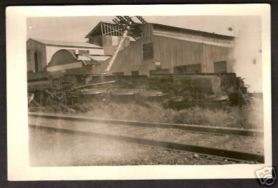 The telegraph pole shown here at a 45 degree angle made an unexpected entry into the adjacent building as shown. As a result of a train derailment. Location and exact date are unknown. However I presume this picture was taken in the 1930s or so.