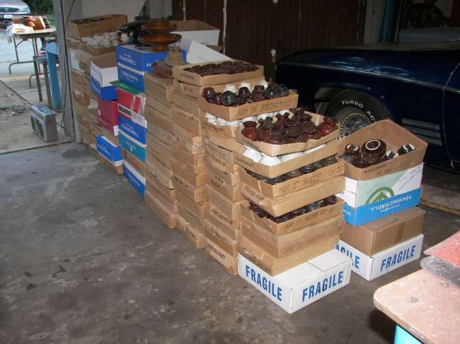 This is one load of insulators to be auctioned at the Sept. 8, 2007 Racine, Wisconsin swap meet. Already almost 40 people have indicated they are coming. The fun starts at 10 a.m. Food is served around noon including corn on the cob, hot dogs, brats, cake, and more. There will be hundreds of pictures taken by the McDougalds to look through. These were recently purchased on eBay and now comes the fun of identifying people and looking at all the insulators they purchased. I'm also bringing all the insulators I traded for at the first national swap meet in Hungary held this past summer. A collection of glass insulators will also be sold at the auction held at 2 p.m. during the show. |
