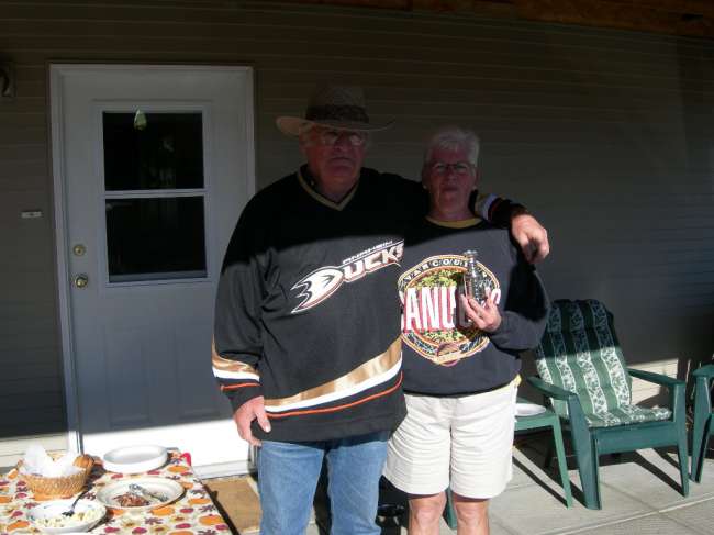 Denny Hackthorne, in several telephone conversations with Bev, discovered she was a Vancouver Canucks hockey fan while Denny was an Anaheim Mighty Ducks supporter. As luck would have it, Vancouver lost to Anaheim who then went on to win the Stanley Cup. In a gesture of cross-border goodwill, Denny presented Bev with her own Stanley Cup miniature. In this shot, both are wearing their favourite teams sweaters. Bev is convinced that Vancouver will go all the way to the cup next year. Thanks Denny. |
