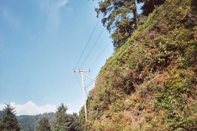The amount of space between this cliff and the bay shore line is so limited that there is only room for the 2 lane Highway 101 and a railroad track. The butts of some poles are in the ground literally right next to the pavement edge. There is no way to run a guy wire over the road to another pole in the usual manner. So they resort to an age old, tried and true line construction method. The push brace! |